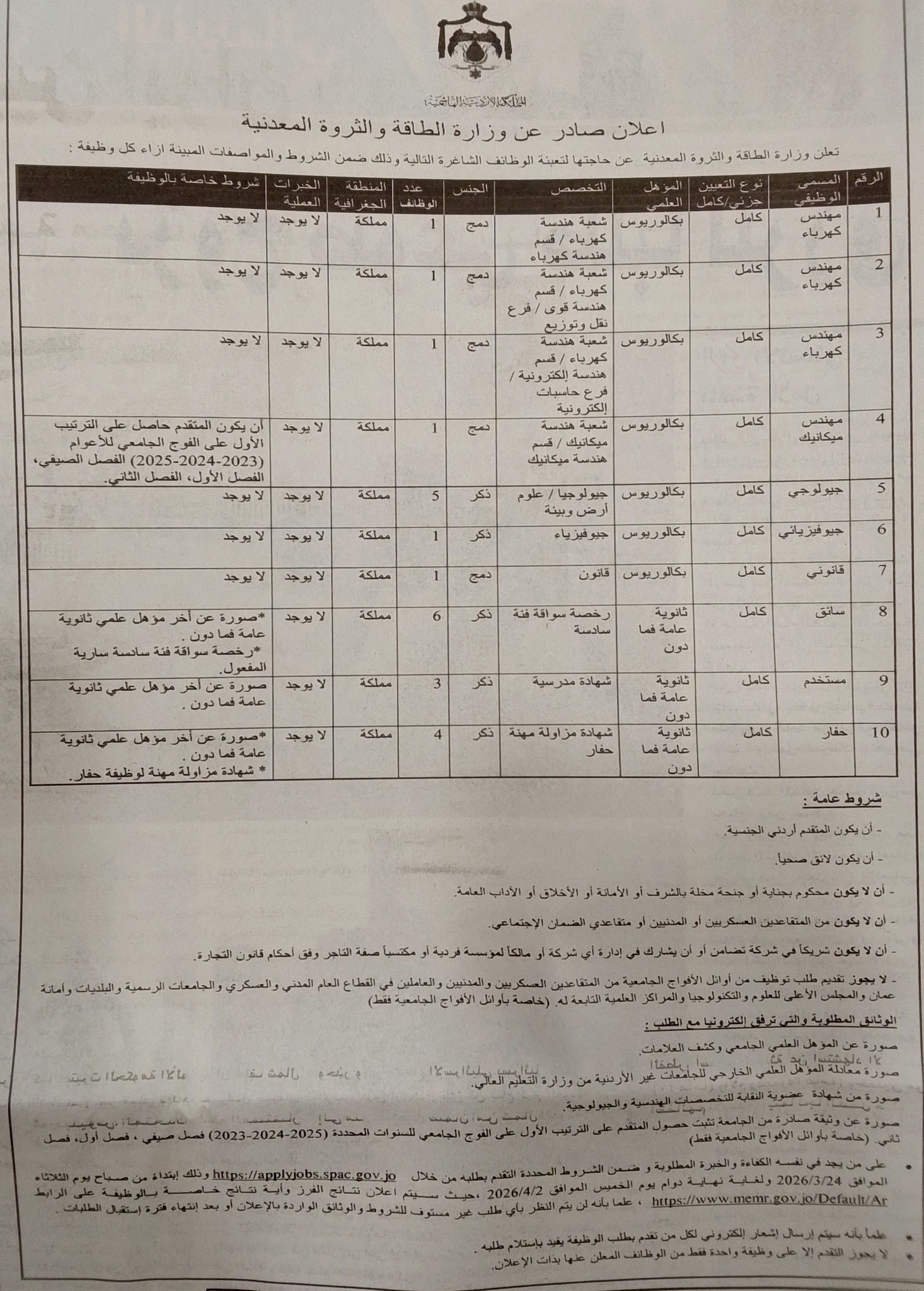 تعلن وزارة الطاقة والثروة المعدنية عن توفر شواغر للتعيين بوظائف رسمية لحملة درجة البكالوريوس، وذلك ضمن التخصصات التالية: