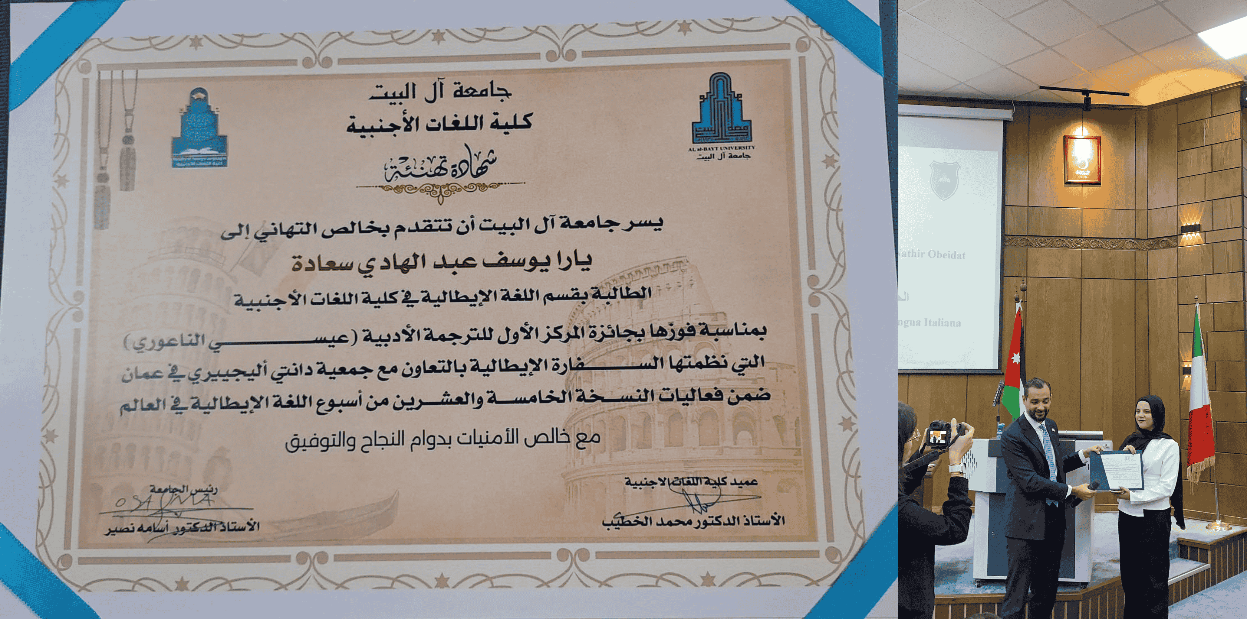 فازت الطالبة يارا يوسف عبد الهادي سعادة بقسم اللغة الإيطالية بالكلية بجائزة المركز الأول للترجمة الأدبية "عيسي الناعوري" التي نظمتها السفارة الإيطالية بالتعاون مع جمعية دانتي أليجييري في عمان ضمن فعاليات النسخة الخامسة والعشرين من أسبوع اللغة الإيطالية في العالم ٢٠٢٥. وقد تم تكريم الطالبة اليوم خلال اليوم العلمي الذي نظمه قسم اللغة الإيطالية بالكلية للاحتفال بأسبوع اللغة الإيطالية في العالم في نسخته الخامسة والعشرين تحت عنوان "الإيتالوفونيا: لغة تتجاوز الحدود".