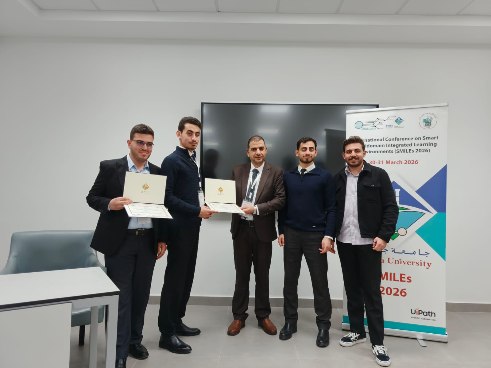 In line with the vision of Al al-Bayt University in supporting scientific research and innovation, the Prince Al-Hussein Bin Abdullah II Faculty of Information Technology is pleased to announce a new scientific achievement by its students, represented by the acceptance of three research papers for publication in IEEE Xplore following their presentation at SMILEs 2026, which was held at Jadara University.